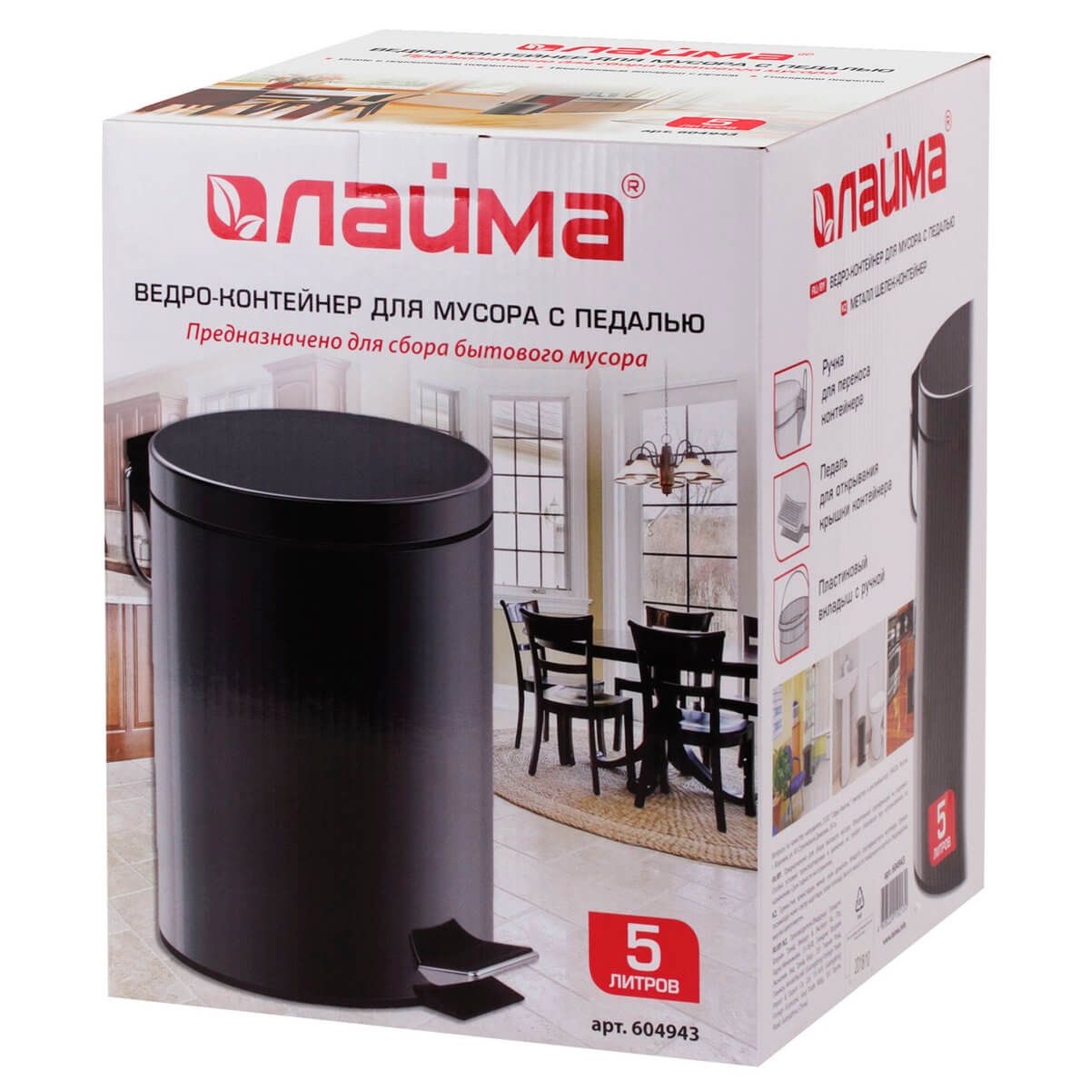 Ведро-контейнер для мусора (урна) с педалью LAIMA Classic, 5 л, черное, глянцевое, металл, со съемным внутренним ведром